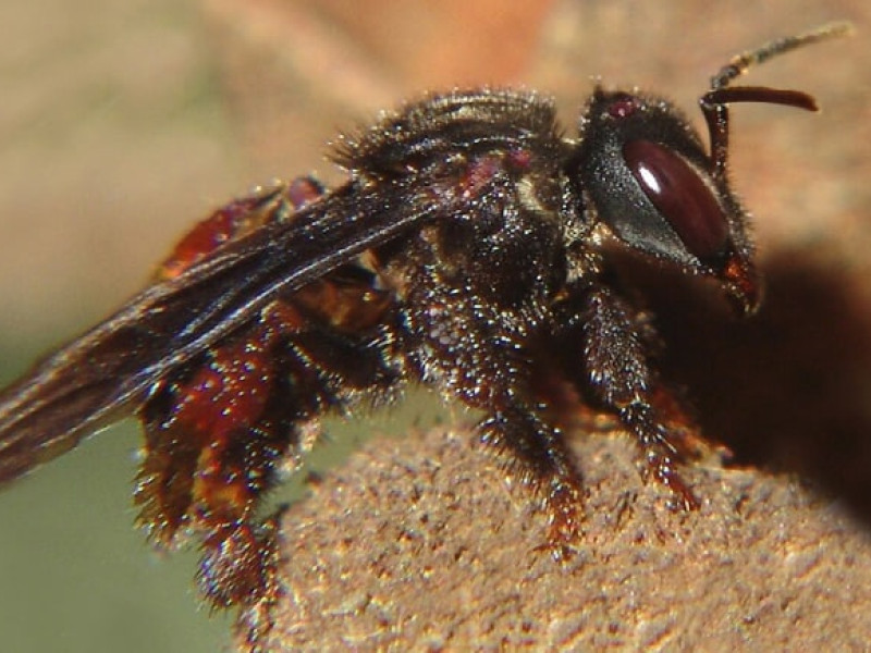 Внешний вид пчел-стервятников: Пчелы-стервятники имеют темное, почти черное тело, покрытое густыми волосками. Их крылья также темные, почти непрозрачные, с небольшим синим или фиолетовым отливом на краях.